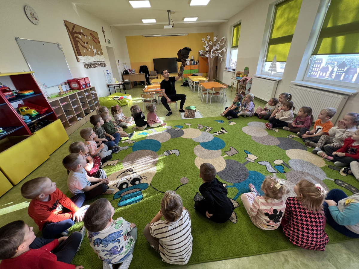Dzieci były zachwycone i pełne podziwu, gdy mogły z bliska zobaczyć tak dostojnego ptaka drapieżnego.